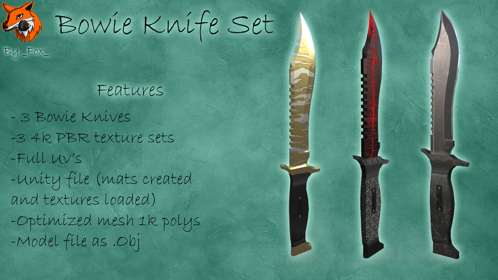 - 3 Bowie Knives -3 4k PBR texture sets -Full Uv’s -Unity file (mats created and textures loaded) -Optimized mesh 1k polys -Model file as .Obj